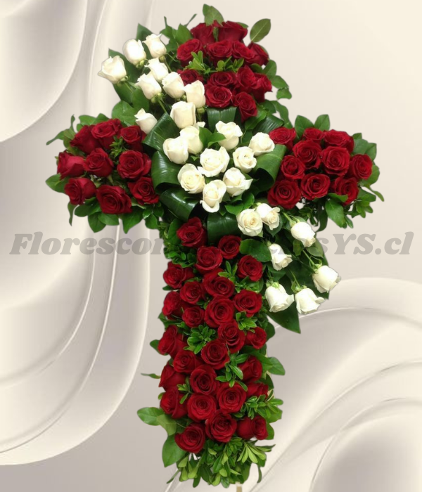 Corona ofrenda cruz en 100 rosas importadas follaje y atril